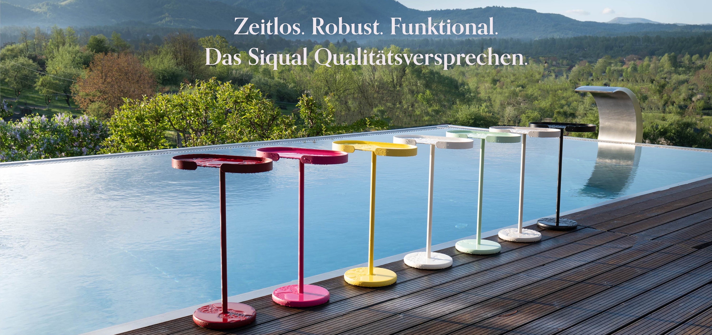 Alle Möbel von Siqual Design werden aus pulverbeschichtetem Aluminium gefertigt. Das Material ist leicht, stabil und besonders langlebig. Die Oberfläche bleibt pflegeleicht und widerstandsfähig gegenüber Feuchtigkeit und Witterung. Dadurch eignen sich viele Produkte sowohl für Innenräume als auch für den Einsatz im Außenbereich.